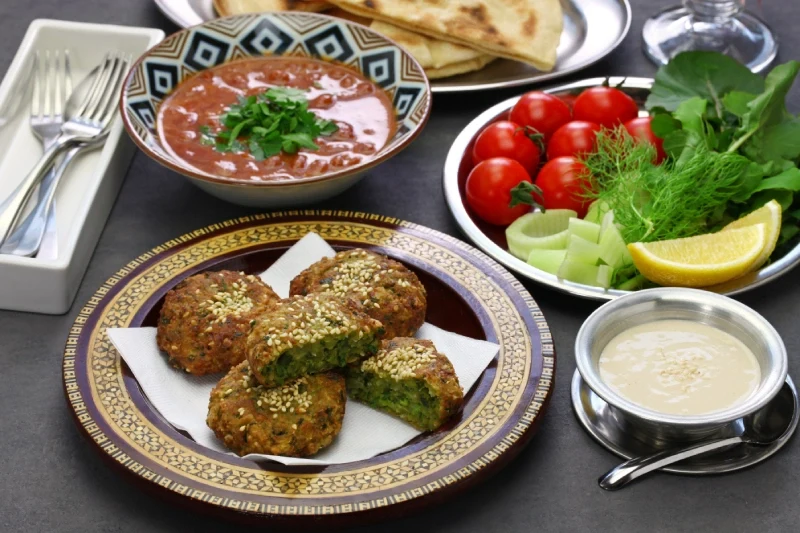 Il falafel è un altro popolare piatto dai piatti tipici egiziani meze a base di ceci macinati o fave e spezie, formato in palline o polpette e fritto. Viene spesso servito in un panino pita con verdure e salsa tahini.