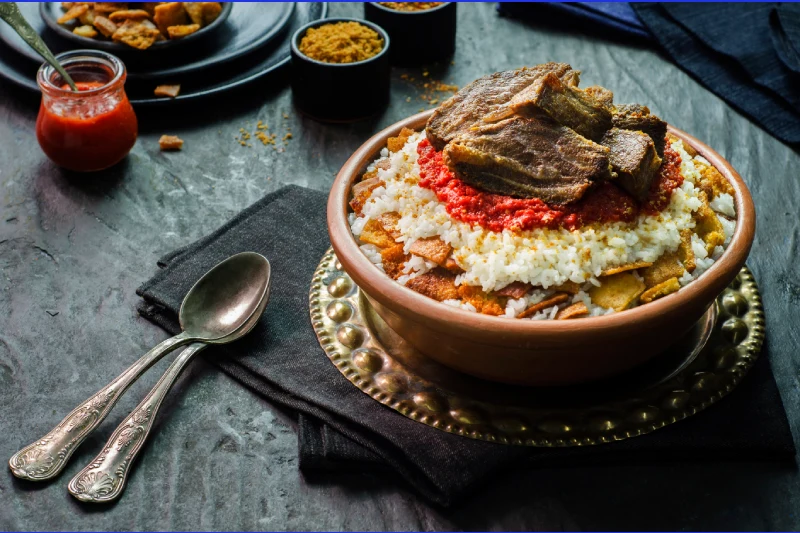 Fatta è un piatto a strati composto da pane, riso e carne (come pollo o agnello). Viene tipicamente servito come piatto principale ed è spesso accompagnato da una varietà di contorni.
