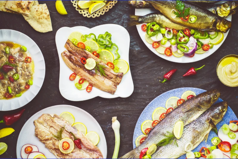 Pesce e frutti di mare in Egitto sono tipicamente serviti con riso o pane e sono accompagnati da una varietà di verdure. In diverse regioni dell'Egitto, potrebbero esserci variazioni nei tipi di pesce e frutti di mare utilizzati e nelle spezie e nei condimenti aggiunti a questi piatti.